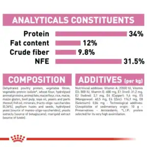 - التركيب: بروتين دواجن مجففة ، ألياف نباتية ، عزل بروتين نباتي * ، دقيق قمح ، بروتينات حيوانية متحللة ، دهون حيوانية ، دقيق ذرة ، أرز ، ذرة ، جلوتين الذرة ، لب البنجر ، زيت صويا ، خمائر وأجزاء منها ، زيت سمك ، معادن ، فركتو-أوليجو-سكريات (0.36٪) ، قشور وبذور سيلليوم ، خميرة متحللة (مصدر مانو-أوليجو-سكريات) ، مستخلصات الخميرة (مصدر بيتاجلوكان) ، مستخلص القطيفة (مصدر لوتين).